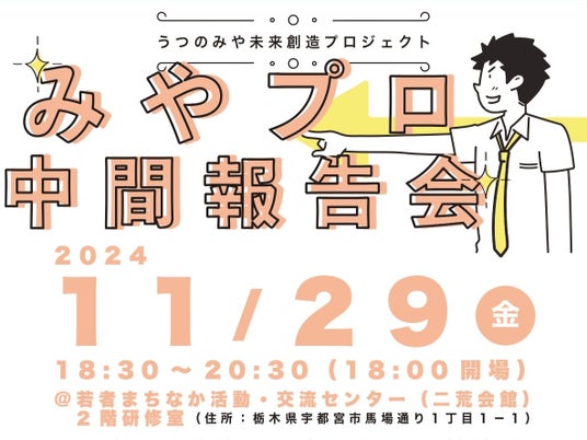 宇都宮市(市長:佐藤栄一)は、20代~30代の宇都宮市役所の職員と宇都宮市の民間企業の社員がつながり、官民連携で「宇都宮市にあってほしい取り組み」を検討するプロジェクト「うつのみや未来創造プロジェクト(通称:みやプロ)」の中間報告会を2024年11月29日(金)18:30~20:30、若者まちなか活動・交流センター(二荒会館)2階研修室にて開催します。今年度は、6つのチームが活動に取り組んでおり、中間報告会では、各チームが現在考えているまちづくりの取組について発表します。本プロジェクトに関心のある方、発表のテーマに近い取組をされている民間企業の方やNPO団体の方など、ぜひ奮ってご参加ください。なお本プログラムはNPO法人とちぎユースサポーターズネットワーク(代表理事:岩井俊宗)が事務局として運営補助を担います。