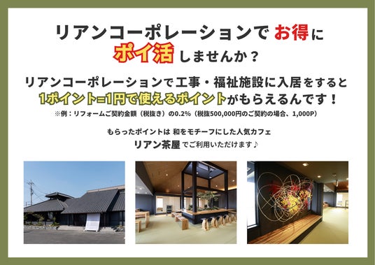 栃木県宇都宮市を本拠点とし、住宅リフォーム/不動産事業/介護施設・運営/新築工事/カフェを経営する株式会社リアンコーポレーションが、リフォームをされたお客様・新築住宅を建築されたお客様・福祉施設ご入居者様に向けたポイント進呈(ポイ活)を開始しました。