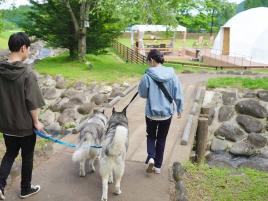 大型犬も2頭まで同伴できる専用ドッグラン付きテントも2棟ご用意。大自然に囲また広々ドックランではリード無しでワンちゃんもたちも大はしゃぎ。冬のアウトドアをワンちゃんとぜひご体験ください。