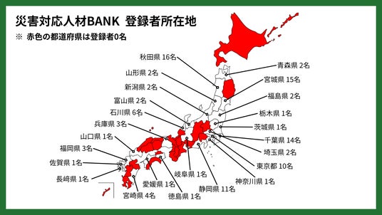 登録者の所在地に偏りがあり、登録者が0名の都道府県がまだ多くあります。そうした地域で災害が発生した場合、支援開始が遅れる可能性が高くなります。この課題を解決すべく、全国的な登録者の増加を図り、全都道府県での対応体制を整えます。