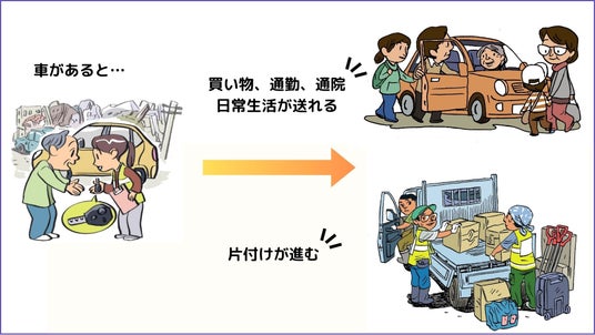 災害時に車を失った被災者の多くは通勤・買い物・片付け等、日常生活や再建の歩みに支障をきたします。その状況に対し、協会では東日本大震災後に起こった26の災害で7,800件以上の車の無償貸出支援を行ってまいりました。