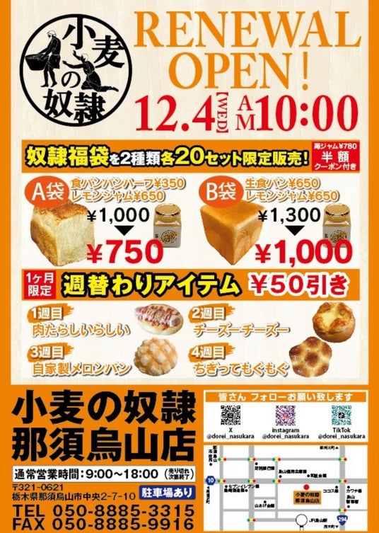2024年12月4日(水)、栃木県那須烏山市の【小麦の奴隷 那須烏山店】が新たな体制でリニューアルオープンします。オープンを記念して、12月4日(水)から11日(水)まで、食パンとジャムをセットにしたお得な福袋の販売を行います。また、12月中は週替わりで限定アイテムの割引も実施します。この特別な機会を、ぜひお見逃しなく!