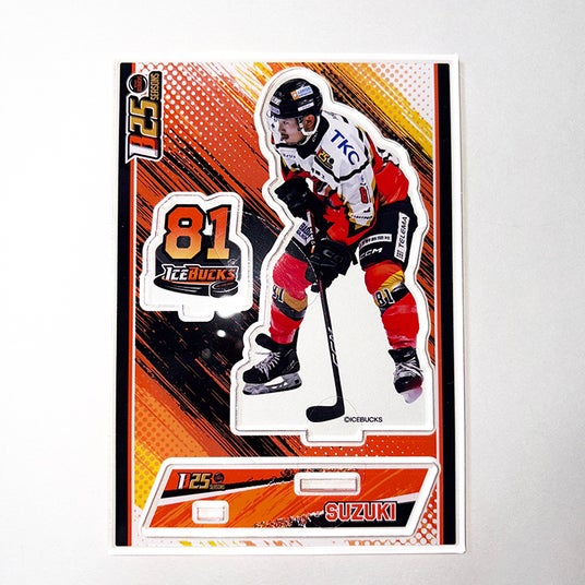選手がプレーしている姿をアクリルスタンドに落とし込みました。