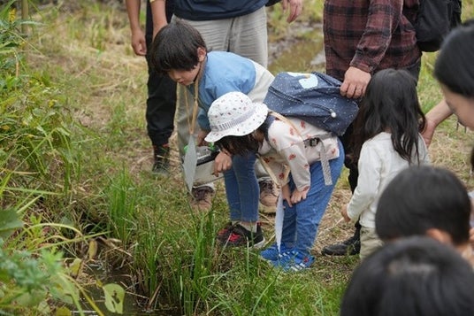 池に共存する昆虫類に触れる子どもたち