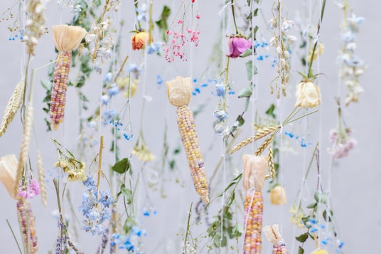 イベント期間中、レセプションにユーカリやローズマリー、トウモロコシなどを組み合わせた装飾を施し、360度花やハーブ、野菜に包まれるような空間を演出。花やハーブを1本の糸で連なるようにくくり、天井から吊り下げて装飾します。ソファに座って見上げてみたり、装飾の中に入って写真を撮ったりと、一味違ったお花見を満喫できます。