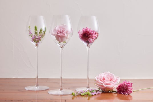 花の香ラウンジでは、花やハーブの香りとワインを一緒に堪能する体験ができます。テーブルには、香り豊かなバラやラベンダー、ハナホジソが入ったワイングラスを用意。丸みのあるグラスが香りを閉じ込め、繊細な香りの違いを引き立たせます。また、3種類の花の香りに合わせた、芳醇でまろやかな白ワインやジューシーで果実味豊かなオレンジワイン、ベリー系のフルーティーなロゼワインの3種類のワインのセットを販売します。花やハーブの香りに包まれながらワインを味わい、優雅なひとときを過ごせる体験です。