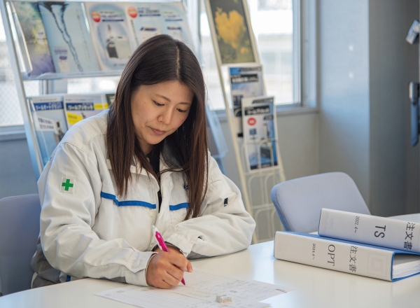 電話対応やメールのチェック、発注など事務業務全般を担当するほか、図面の改訂など技術的なサポートも行っています。現在は、採用活動の一環として、企業のP Rやブランディング戦略を推進する新規プロジェクトにも参加しています。社内外の多くの関係者と連携しながら新しい分野に挑戦できるので、通常業務との同時進行が大変ではありますが、それを上回る面白さがあります。