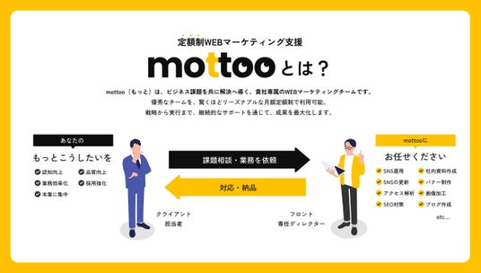 そこでRevisionは、企業の「もっと」を叶えるための新たな打ち手として、定額制Webマーケティングサービス「mottoo」の提供を開始します。「mottoo」は、高度な専門スキルを持つマーケティングチームを月額10万円から利用できる定額制サービスです。