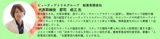 栃木県内やベトナムで美容室など9業種17店舗を展開するビューティアトリエ代表の郡司さんに、自ら歩んできた「アトツギとしてのキャリアデザイン」について、お話いただきます。