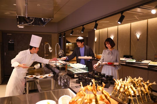 ライブキッチンやバーカウンターに並べられた、目でも舌でも楽しめるこだわりの料理の数々を、光り輝く星に見立てて名付けられた、レストラン「星月夜(ほしづきよ)」で、旅ならではの贅沢な時間をお過ごしいただけます。