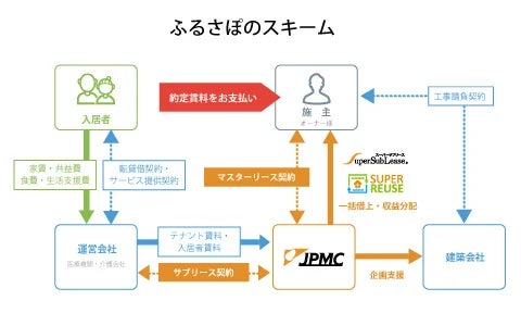 このような中、JPMCのシニアハウス事業部では「ふるさぽシリーズ」として、全国に広がるJPMCのネットワーク(建築業者・介護事業者)を通じて「有料老人ホーム・サービス付き高齢者向け住宅」の1.事業判断時のエリアマーケティング、2.建築プランニングの助言・監修、行政機関折衝補助、3.運営にあたっての運営介護事業者(以下「FP(ふるさぽパートナー)」)の選定、4.運営開始後の施設運営サポートまでトータルコーディネートを行い、さらに、物件をサブリースすることによってオーナー様の安定収入を実現してまいりました。