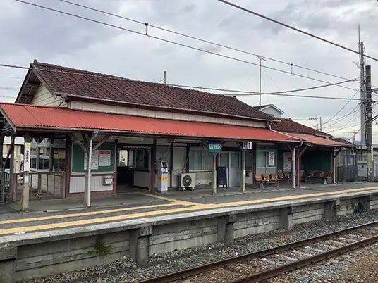 両毛線「山前駅」で休憩のためドアが開きます。山前駅では2番線停車し、懐かしの木造駅舎をバックに車両をご覧いただけます。