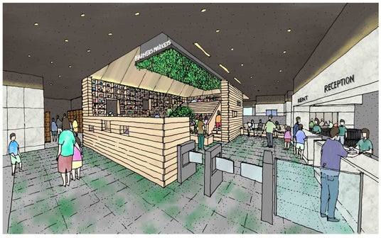 エントランスは吹き抜けを生かした立体的で象徴的な空間に生まれ変わります。地元の野菜やお土産品を取り揃えたファーマーズマーケット兼ライブラリーで真岡の魅力をより感じることができます。