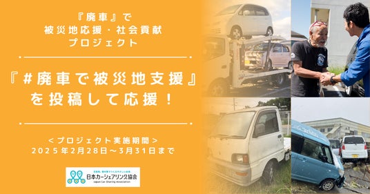 一般社団法人日本カーシェアリング協会(宮城県石巻市 代表理事:吉澤武彦 以下、「協会」)は、#廃車で被災地支援 というハッシュタグをつけたSNS投稿を呼びかけるキャンペーンを2月28日から3月31日まで実施し、日本全国から廃車する車の寄付を募ります。当初2月28日までとしていた廃車の寄付募集プロジェクト期間を同日の3月31日まで1か月間延長することとし、廃車が増える3月に広く車の寄付の選択肢を知り、参加を呼びかけます。