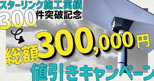 この度、300件突破を記念して、個人宅向けスターリンク工事を対象とした総額30万円のキャンペーン割引を実施します。抽選や人数制限ではなく、割引の合計額が30万円に到達するまで適用されるため、より多くの方にご利用いただける内容です。