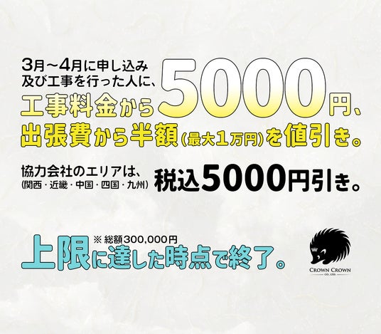 クラウンクラウンの協力会社による施工の場合、工事料金から5,000円(税込)割引を適用いたします。