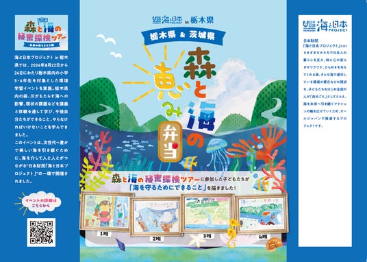 海と日本プロジェクト in 栃木県は、2024年8月22日から24日にわたり栃木県内の小学5・6年生を対象とした環境学習イベント「栃木発!森と海の秘密探検ツアー未来の海をまもり隊」を実施しました。イベントに参加した子どもたちが「海を守るためにできること」を描いた絵をパッケージにした「森と海の恵み弁当」が宇都宮市のおべんとう・おそうざい「あかり」で3月31日まで期間限定で販売しています。この取り組みは、次世代へ豊かで美しい海を引き継ぐために、海を介して人と人とがつながる“日本財団「海と日本プロジェクト」”の一環です。