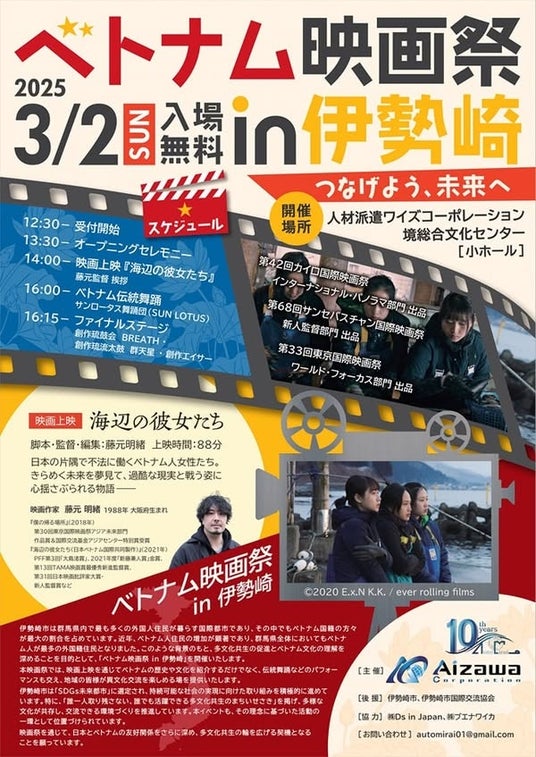 株式会社Aizawa Corporation(代表取締役 木村 雅彦)は、映画を通じて多文化共生を実現するための活動を展開しております。2025年3月2日には「ベトナム映画祭 in 伊勢崎」を開催し、人と人、国と国をつなぐ重要な場となりました。このイベントは、文化的な交流を促進し、参加者全員が共感し合う機会を提供しました。文化を超え、心を通わせ、互いの歴史を知ることで、新たな未来を創る第一歩となりました。伊勢崎市には国内外から多くの仲間が集まり、映画を通じて語り合い、伝統文化を介して共に感動し、音楽を通じて心を一つにする、まさに多文化共生の象徴となる一日でした。