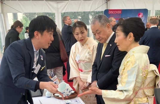 レセプションには政府・国民議会関係者、経済界関係者、教育・文化関係者、外交団等多くの方々が出席しました。参加者の方々に三川内の技術を見ていただくため、平戸洸祥団右ヱ門窯の中里太陽さんによる細工のデモンストレーションを実施したほか、作品である盃で日本酒を試飲していただくなど、「文化の架け橋」として制作した三川内焼の陶芸作品の魅力を伝えました。
