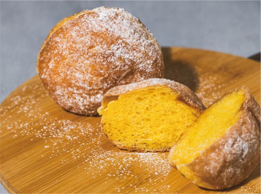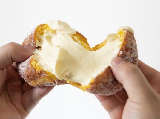 トリュフドーナツについて生地にはかぼちゃを練り込み、クリームたっぷりのふわふわとろとろ、生食感生ドーナツです。