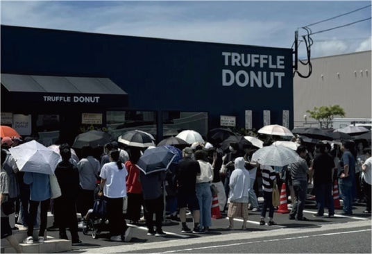 鳥取からスタートしたトリュフド―ナツ、現在は鳥取本店、島根県店、鹿児島県(与次郎店、天文館店、霧島店)、京都店、大分店(3月22日オープン予定)、熊本店(3月23日オープン予定)と8店舗を展開しています。どちらの店舗も連日、行列ができ、京都店では販売開始から2時間ほどで整理券が完売となるほどの人気ぶりです。トリュフドーナツ1店舗目となる鳥取店では、全国で一番人口が少ない県でありながら、初日に450人が並ぶほどの大盛況で1か月で販売数3万個を記録し、当初の計画比の約150%以上の爆発となりました。全店舗オープン日には長蛇の列ができる人気ぶりです。