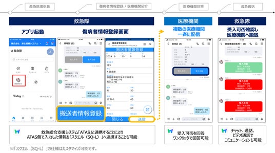 救急搬送支援アプリ「スクエル(SQ-L)」は、「LINE WORKS」をプラットフォームとして、救急現場でより使いやすよう、フォーム入力形式や送信先選択、送信された情報を自動処理する機能を組み込んだアプリです。