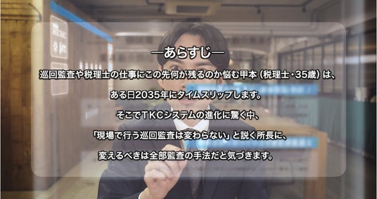 TKC全国会(会長:坂本孝司/事務局:東京都新宿区)は、当会が考えるこれからの税理士事務所の役割をTKC会員に分かりやすく伝えるために制作したコンセプトムービー「税理士の未来」を一般公開したことをお知らせします。当動画は、2035年にタイムスリップしてしまった税理士を主人公とし、ドラマ仕立てで10年後の税理士の業務がどう変わるのかを表現しました。税理士や税理士事務所(会計事務所)で働く職員さん、そして税理士資格の取得を目指す学生の方々などにも視聴いただきたいと考えています。