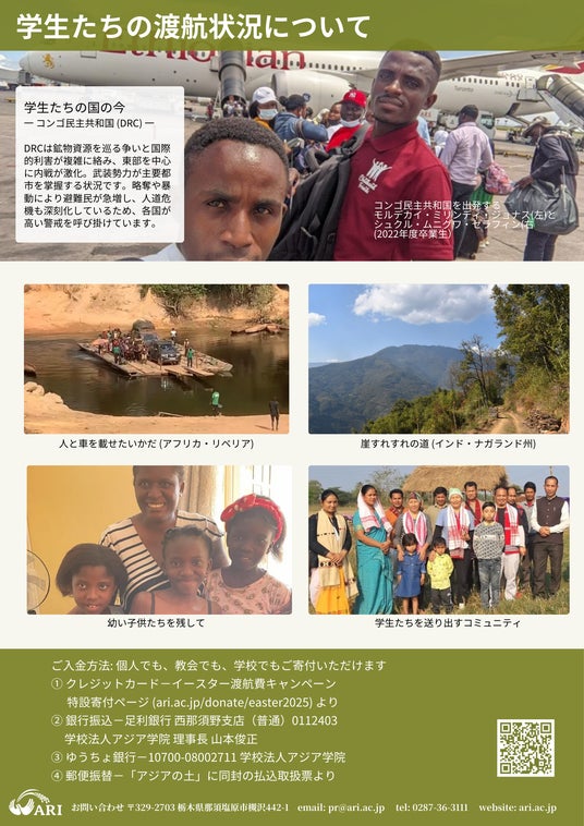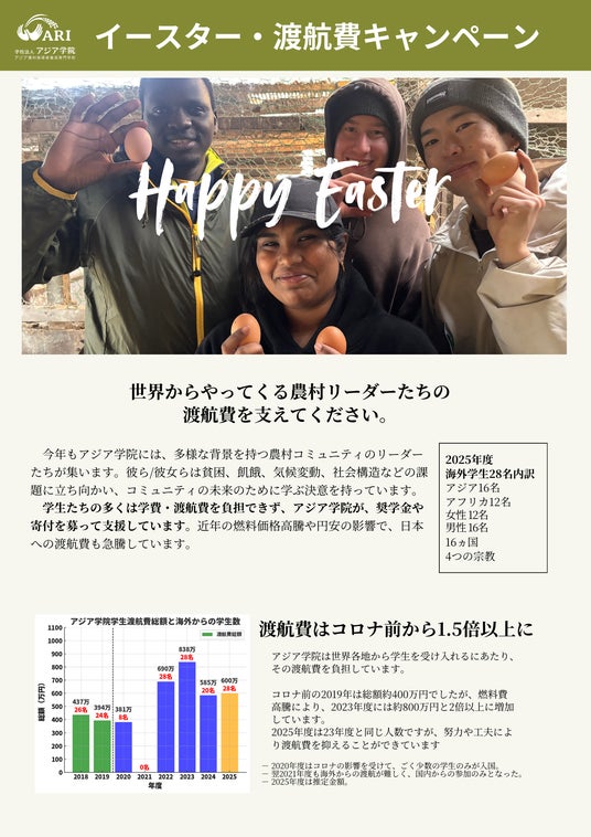 アジア学院は今年、季節ごとにアジア学院や卒業生を知る3つの機会を設けてコンテンツ配信、特設寄付サイトなどを設置。第1弾は、イースター・渡航費キャンペーンです。今週から始まり、4月いっぱいまで行います。