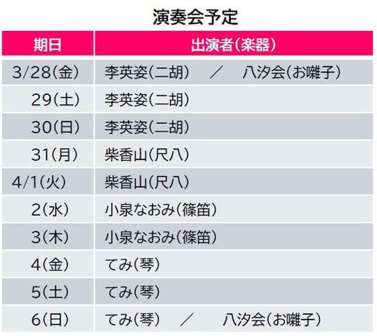 ●和楽器等の演奏会 毎日、日替わりで琴や篠笛等の演奏が行われます