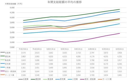 産業ごとの年間支給総額の平均は下表のように推移しており、いずれの産業も新型コロナウイルスが猛威を振るった令和2年に落ち込んだものの、令和3年には宿泊・飲食業を除きコロナ禍以前の水準を超えていることが分かります。