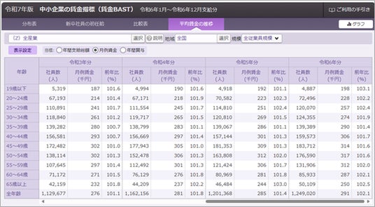 長引く物価上昇への対策や人材確保のために、中小企業も賃上げを検討する機会が増えている状況を踏まえ、令和7年版賃金BASTから「平均賃金の推移」を確認できる機能を新規搭載しました。