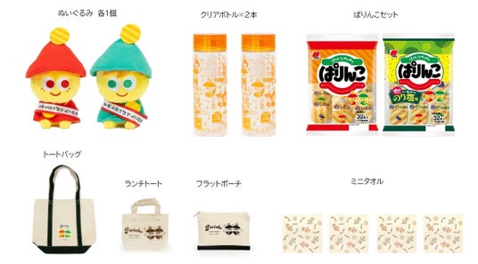 販売中の商品「ぱりんこ」・「ぱりんこ のり塩味」と、公式キャラクター「ぱるん・りるん」のぬいぐるみ、そしてアウトドアやレジャーにも活躍する「ぱりんこ」のオリジナルグッズをお土産としてご用意してお待ちしております。