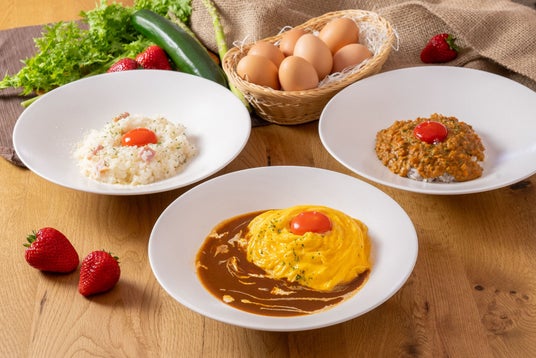 左から、風味豊かなパルメザンチーズリゾット茜たまご乗せ、ハコニワファームの茜卵と水沼養鶏場の卵使用 ダブル卵のふわとろオムライス、夢ポークを使った自家製キーマカレー茜たまご乗せいずれも 1,408円(税込)