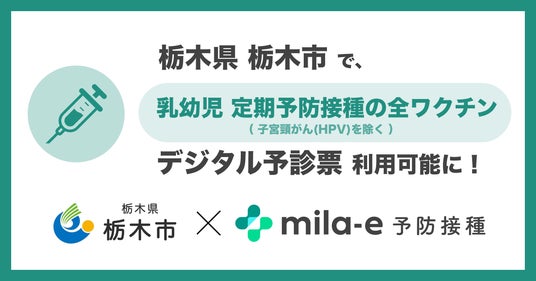 株式会社ミラボ(本社:東京都千代田区、代表取締役:谷川一也、以下「ミラボ」)が、栃木県 栃木市で導入する乳幼児期予防接種デジタル予診票サービス「mila-e(ミライー) 予防接種」において、対象ワクチンにA類疾病全ワクチン(HPV感染症の定期接種を除く)を追加、また医療機関の範囲を拡大し、4月1日より運用を開始します。