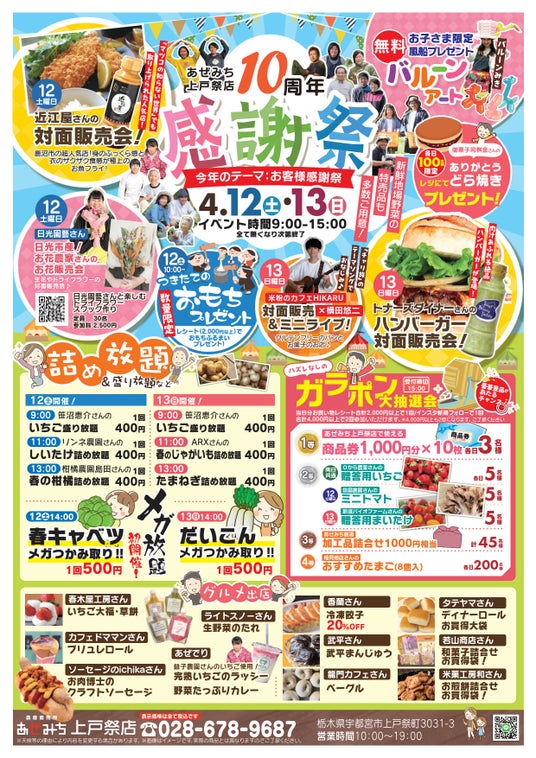 株式会社グリーンデイズ(所在地:栃木県宇都宮市/代表:林 書緯)が運営する「農産物直売所あぜみち上戸祭店」は、2025年4月12日(土)・13日(日)に、開店10周年を記念した『お客様感謝祭』を開催いたします。