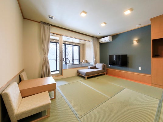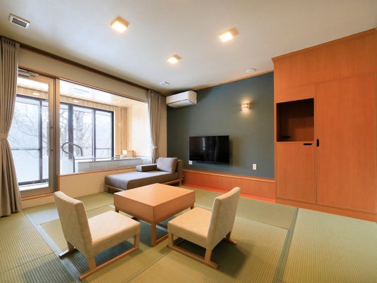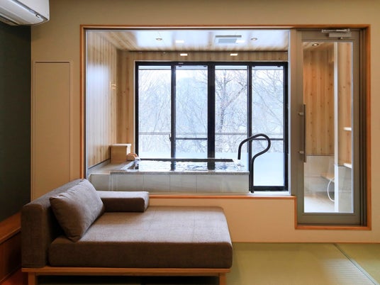 ご宿泊いただく新客室は、自然と調和する心地よいデザインの半露天風呂付き和室で、大きな窓越しに広がる景色を眺めながら、ゆったりと湯浴みを愉しめます。