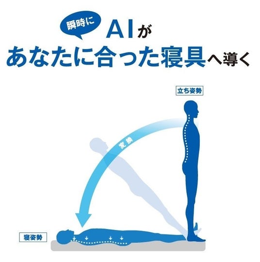 「立った状態で体を測定し、そのデータを寝姿勢に変換する独自の仕組み」×「AI判定」からなる最先端の測定システム。立ったままで測定したデータを瞬時に寝姿勢に変換し、あなたにぴったりの寝具を自動で提案します。立ち姿勢で測定したデータを瞬時に寝姿勢に変換し、AIがそのデータを分析。あなたの体型にぴったり合ったマットレスとまくらを自動で提案します。
