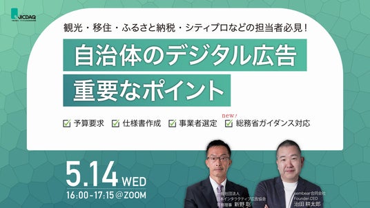 sembear合同会社(エスイーエムベア合同会社 本社:東京都渋谷区 CEO:治田耕太郎)は、2025年5月14日に一般社団法人デジタル広告品質認証機構(JICDAQ)が主催する自治体職員向けウェビナー「デジタル広告基礎講座」に代表の治田が登壇しますことをお知らせいたします。当日のウェビナーでは、多くの地方自治体のデジタルマーケティング支援・アドバイザリーを務めている経験をもとに、自治体がデジタル広告を実施する上で必要不可欠な「予算の立て方」「仕様書策定」そして「プロポーザル審査」に至るまでを徹底解説いたします。デジタル広告に携わる自治体職員の皆様は是非ご参加ください。