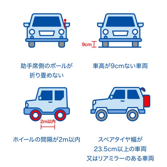 A: 下記のような車両は構造上ご利用いただけません。また、車両の状態によってはスタッフの判断でご利用をお断りする場合がございますので、あらかじめご了承ください。