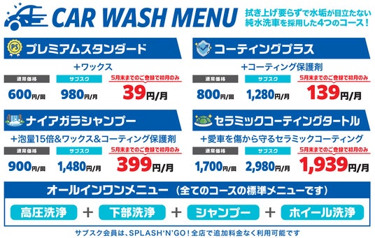 新前橋店のオープンを記念して「39(サンキュー)キャンペーン」SPLASH'N'GO!全店で実施致します。期間中、新規でサブスクプランにご入会頂いたお客様は、初月限定で下記の特別価格でご利用いただけます。この機会にぜひSPLASH'N'GO!の高品質な洗車体験をお試しください。