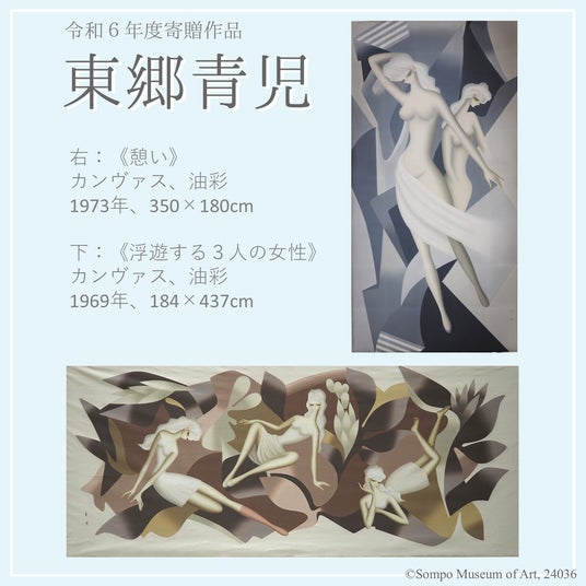 1968年の栃木県上三川町に設立した工場落成記念で制作された「浮遊する3人の女性」と、1973年の六本木本社落成を記念して制作された「憩い」の2点です。
