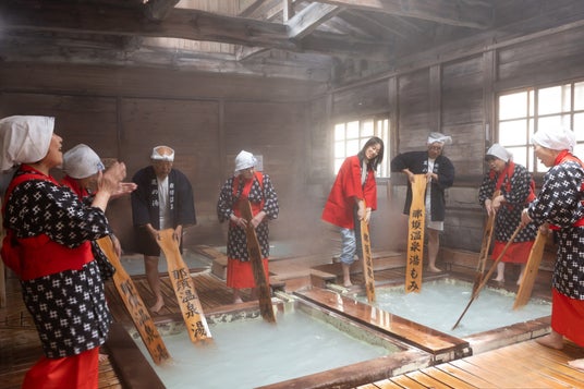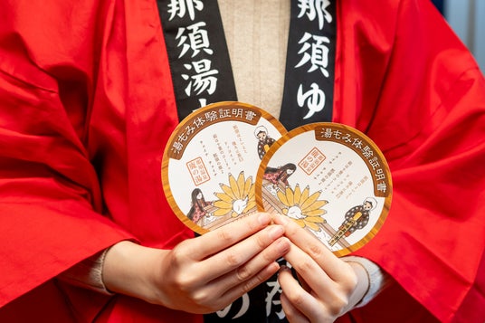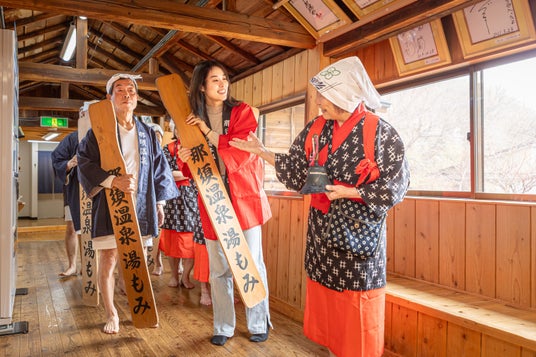 かつて那須では、湯もみは地元旅館の女将たちによってそれぞれ行われていました。時代とともに担い手が減少し、一時は途絶えてしまいましたが、2013年に地元の観光ボランティア有志が「湯もみ保存会」を結成し、伝統の技を復活させて今日まで大切に受け継いでいます。当プログラムでは、「湯もみ保存会」の皆さんが毎年5月から11月毎月最終水曜日に鹿の湯で行っている、この伝統ある湯もみに参加していただきます。袢纏(はんてん)をまとい湯もみ板を手にし、鐘の音を合図に齋藤留美子さんを筆頭とする湯もみ保存会のメンバーとともに浴場へと入り、伝統の湯もみ唄を歌いながらリズムよく専用の板を巧みに操り、湯もみの技を体感していただきます。見学する入浴客からは手拍子が送られ、浴場全体が温かな一体感に包まれます。体験後は自らが揉んだ鹿の湯温泉に浸かり、心と体を癒す贅沢なひとときをお楽しみください。湯もみ体験後は、袢纏姿のまま記念撮影をし、湯もみしている人とその浴槽に浸かっている九尾の狐の絵が描かれた体験証明書を受け取れます。