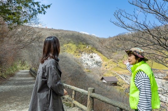 那須温泉神社(なすゆぜんじんじゃ)から鹿の湯へと続く、那須湯本温泉の歴史と伝説・文化が詰まったルートを歩き、道中に点在する13の歴史的スポットを、那須高原湯本ガイドの解説を聞きながら散策します。129段の階段を上ると、那須温泉郷の守護神として建立された温泉神社が厳かに佇んでいます。境内には松尾芭蕉の句碑をはじめ、推定樹齢800年の御神木「生きる」など、由緒あるスポットが複数点在しており、それらを巡りながら本殿へ向かいます。温泉神社を抜けると、高台から賽の河原(さいのかわら)を一望することができます。殺生石(せっしょうせき)がその中心にあり、付近一帯は現在も少量の火山性ガスが噴出しており、硫黄の匂いが感じられます。道中の歴史的建造物を眺めつつ、それぞれにまつわる伝説や物語を聞きながら、約1.5kmあるルートをゆったりと散策し、最終目的地である鹿の湯を目指します。那須の自然を感じながら、千年にもわたる歴史に触れ、この地の更なる魅力を実感するでしょう。