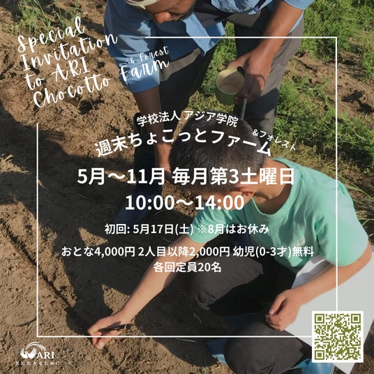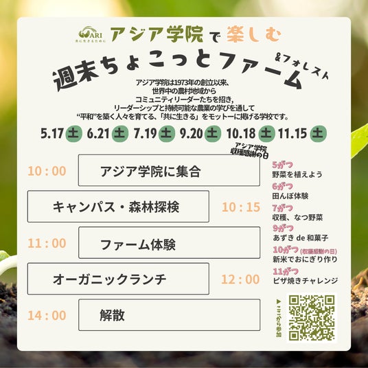 (5/17, 6/21, 7/19, 9/20, 10/18, 11/15 - no session in August)Time: 10:00 AM to 2:00 PMLocation: Asian Rural Institute (Tochigi, Japan)Capacity: 20 participants per sessionFee:Adults: ¥4,000From the second adult onward: ¥2,000Children aged 0-3: FreeWhat to Bring: Comfortable clothes, drink bottle, hat, towel Typical Schedule:10:00 - Gather at ARI10:15 - Campus & forest exploration11:00 - Hands-on farming experience12:00 - Organic lunch14:00 - End Monthly Highlights:May: Let’s plant vegetablesJune: Rice paddy adventureJuly: Harvest & summer vegetablesSeptember: Azuki bean harvesting & wagashi makingOctober: New rice celebration & onigiri makingNovember: Pizza oven challenge