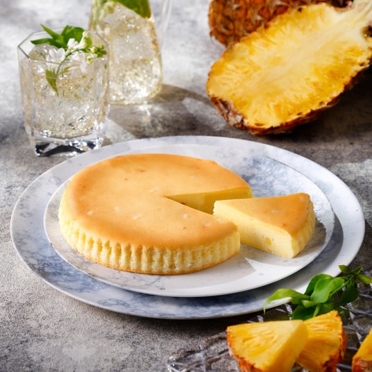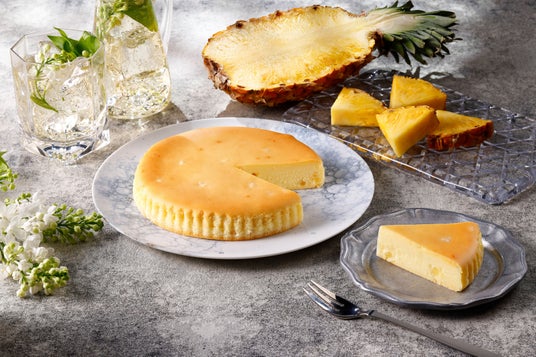 数種類のチーズをブレンドした生地に、細かく刻んだドライパイナップルを混ぜ込み、しっとりと焼き上げたベイクドチーズケーキです。ドライパイナップルを合わせることで、生地にパイナップルの風味や甘さがひろがり、果肉感も楽しめます。パイナップルの絶妙に調和した甘みと酸味と、チーズのミルク感が相まった味わいの一品です。そのままでのお召し上がりはもちろん、冷やしてお召し上がりいただくと、生地の濃密度が増し、さらにしっとりとした食感とパイナップルのフルーティーな味わいをご堪能いただけます。