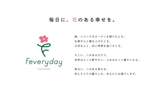 「Feveryday(フェブリデイ)」は、Flower(花)とEveryday(毎日)を掛け合わせた造語です。“たくさんの人々に、毎日の暮らしの中で花を楽しんでほしい”という願いを込めて生まれました。