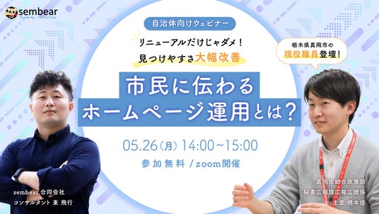 sembear合同会社(エスイーエムベア合同会社 本社:東京都渋谷区 CEO:治田耕太郎)は、2025年5月28日(月)に『リニューアルだけじゃダメ!見つけやすさ大幅改善 市民に伝わるホームページ運用とは…?』と題したウェビナーを開催することをお知らせいたます。本ウェビナーでは、「なんかうちのホームページはわかりにくい。」「住民からホームページがわかりにくいと言われる。」自治体関係者の皆さまに、どのようにすればわかりやすいホームページに改善できるのかのポイントを徹底解説。“市民にとってわかりやすいホームページ”を目指してホームページ改善を行ってきた、栃木県真岡市の現役市役所職員をゲストに迎え、「わかりやすいホームページとは何か・わかりやすいホームページに改善するための真岡市の挑戦」についてお話を伺います。