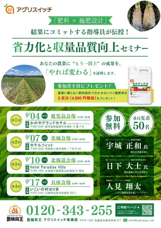 株式会社リンク(農機具王 アグリスイッチ事業部)は、6/7(土)に茨城県土浦市で肥料設計セミナーを開催。「収量・品質を上げたい」と本気で願う生産者様のために、必ず結果を出してもらう気持ちで挑みます。