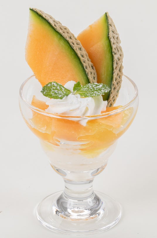 瀬戸内レモンを使用したジュレ、バニラとメロンの2種のアイスをトッピングし、贅沢にメロンを添えました。
