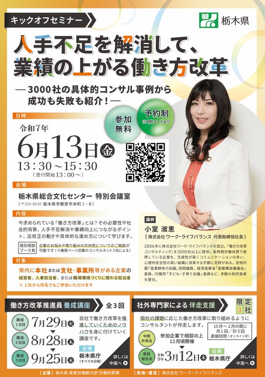 キックオフセミナーは、2025年6月13日(金)13:30~15:30に栃木県総合文化センターにて無料で開催し、当社代表取締役社長・小室淑恵が「人手不足を解消して、業績の上がる働き方改革-3000社の具体的コンサル事例から、成功も失敗も紹介!-」と題し、3,000社の事例から成果につながる働き方改革の進め方を解説します。終了後は、コンサルタントとの個別相談も可能です(申込ページ:https://work-life-b.co.jp/20250613.html)。